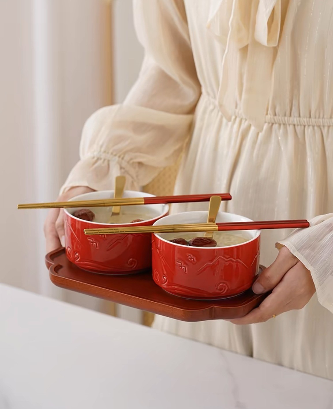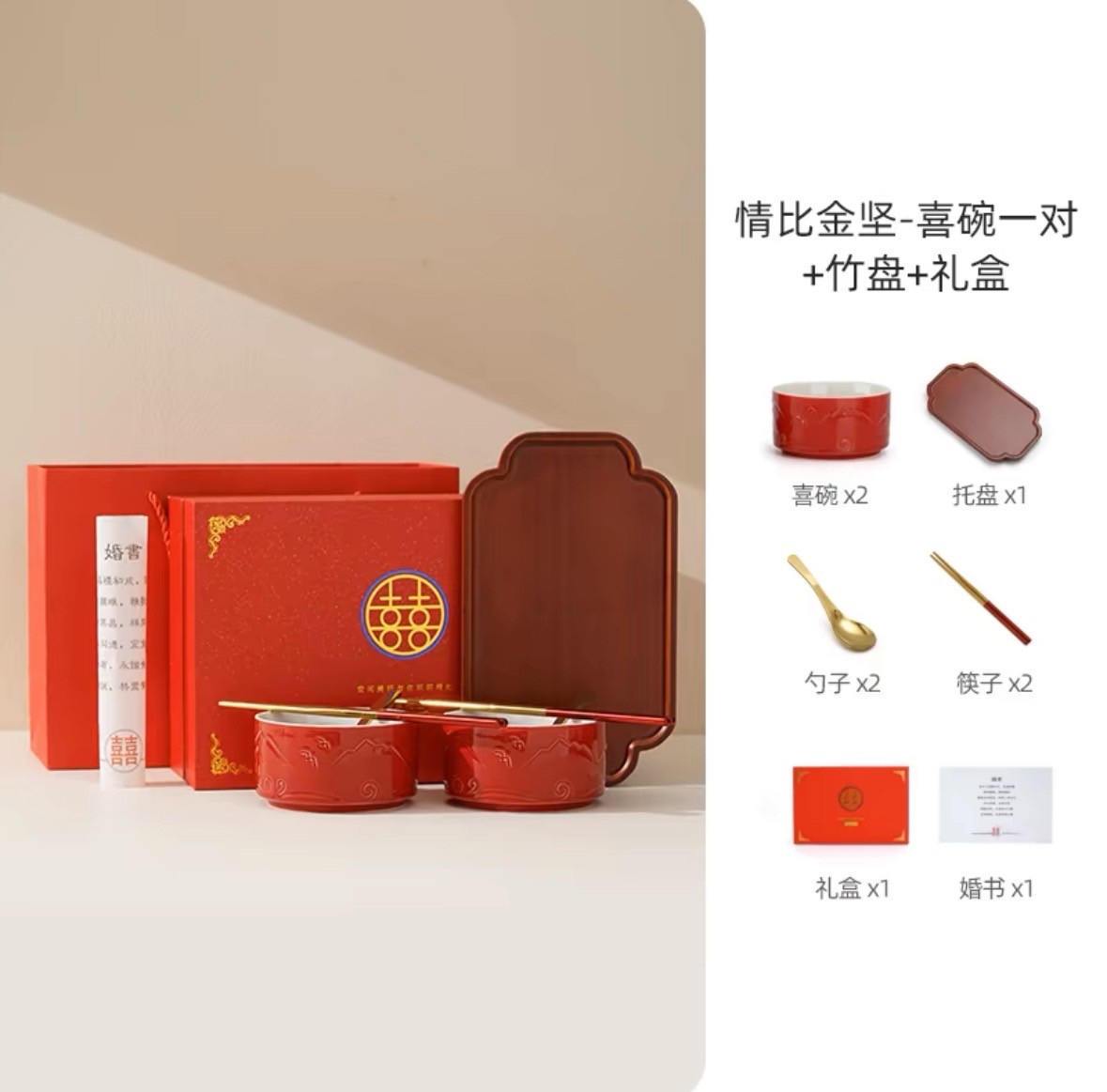 【良辰囍品】情比金堅-红色喜慶订婚喜碗x一對+托盤+婚書+禮盒