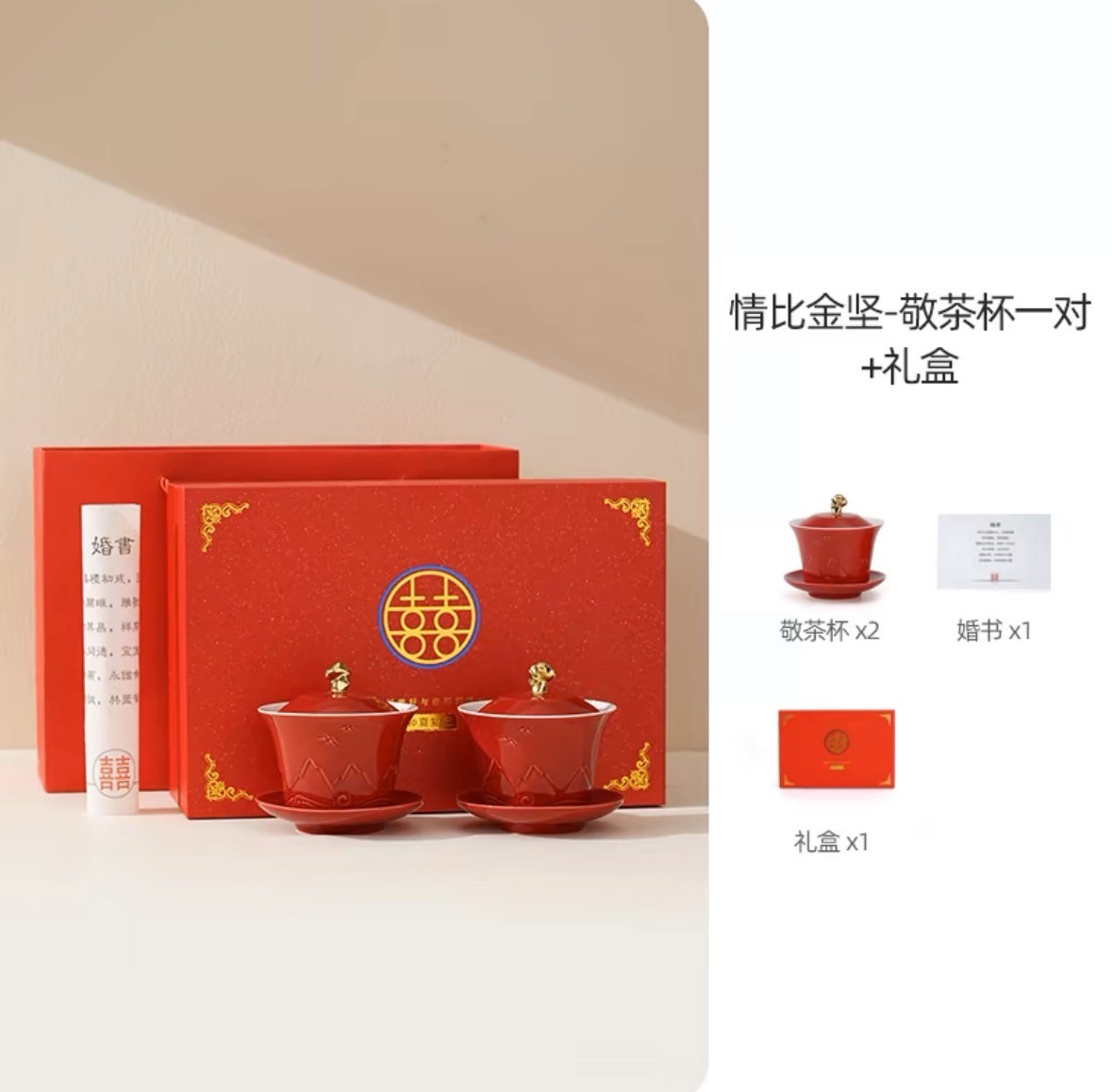 【良辰囍品】情比金堅-红色喜慶订婚敬茶杯子x一對+婚書+禮盒